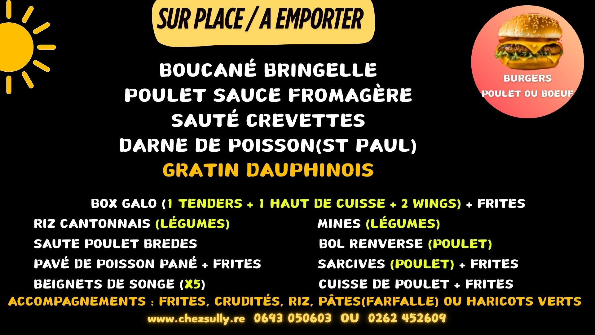 CHEZ SULLY est également un restaurant incontournable pour ceux qui adorent les poulets croustillants. Vous pouvez commander des pièces de wings, de hauts de cuisses, de tenders et d’ailes, ou bien, des buckets S, L ou XL.